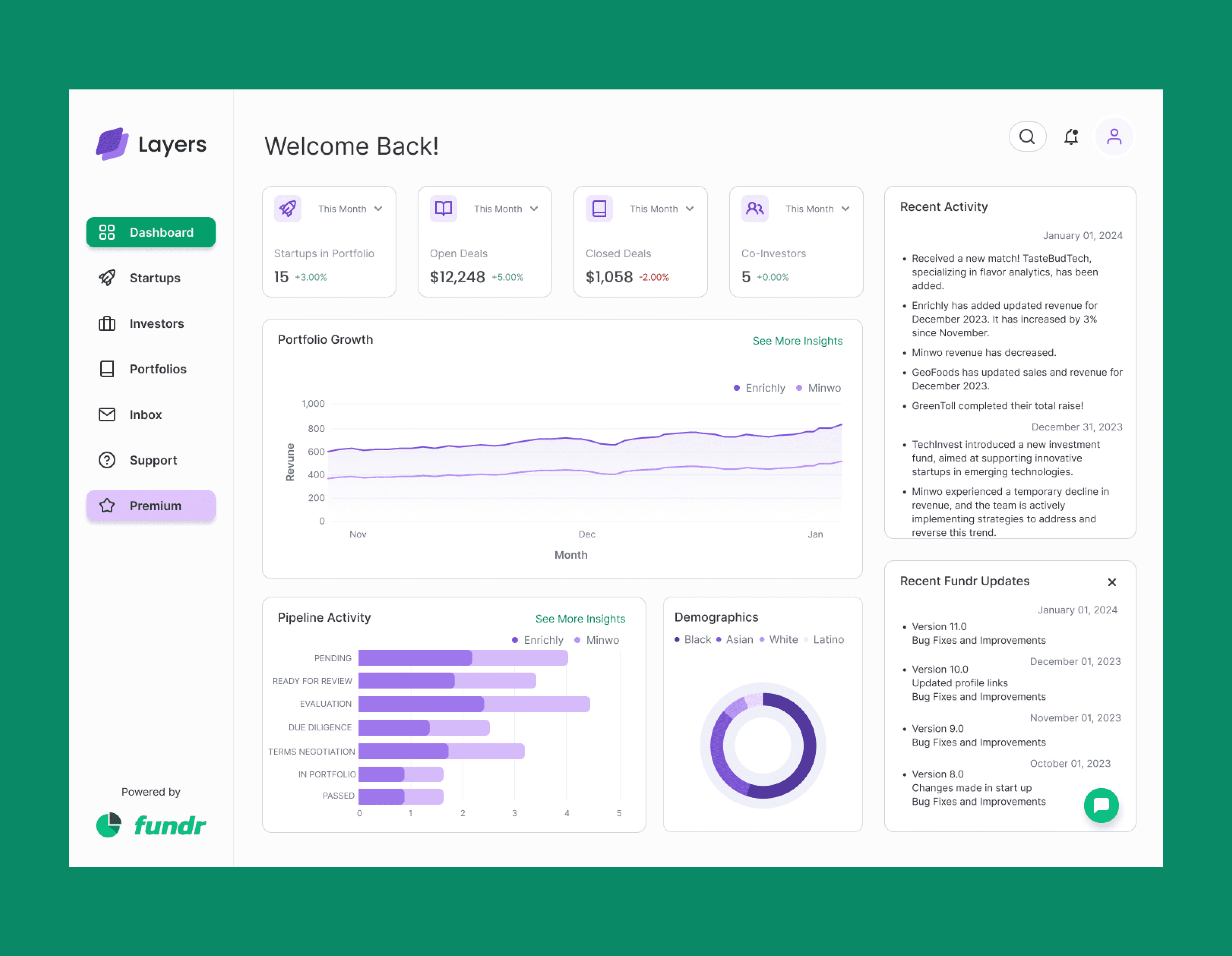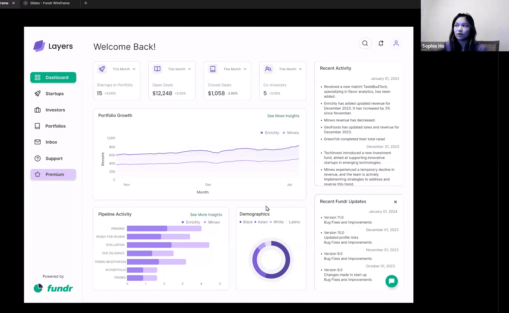 - I reimagined Fundr's dashboard and pitched new ideas to them. Having users experience their features before upgrading allows them to see the progress in their investment. - I have also included a place where the users can see any recent activity and Fundr updates.