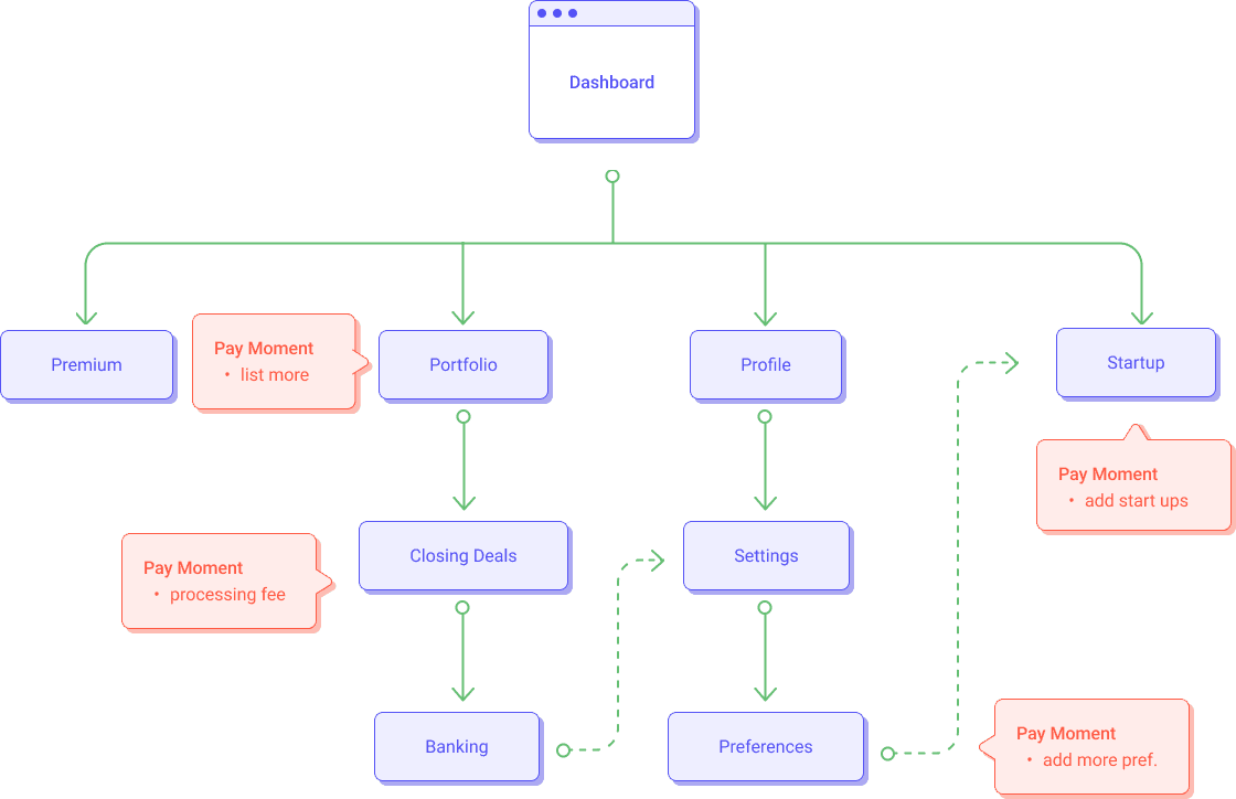 For the user flow, the starting point is the dashboard. The user is able to navigate to four pages. As they continue, there are pay moments where they have the option to view or upgrade to the higher tier.